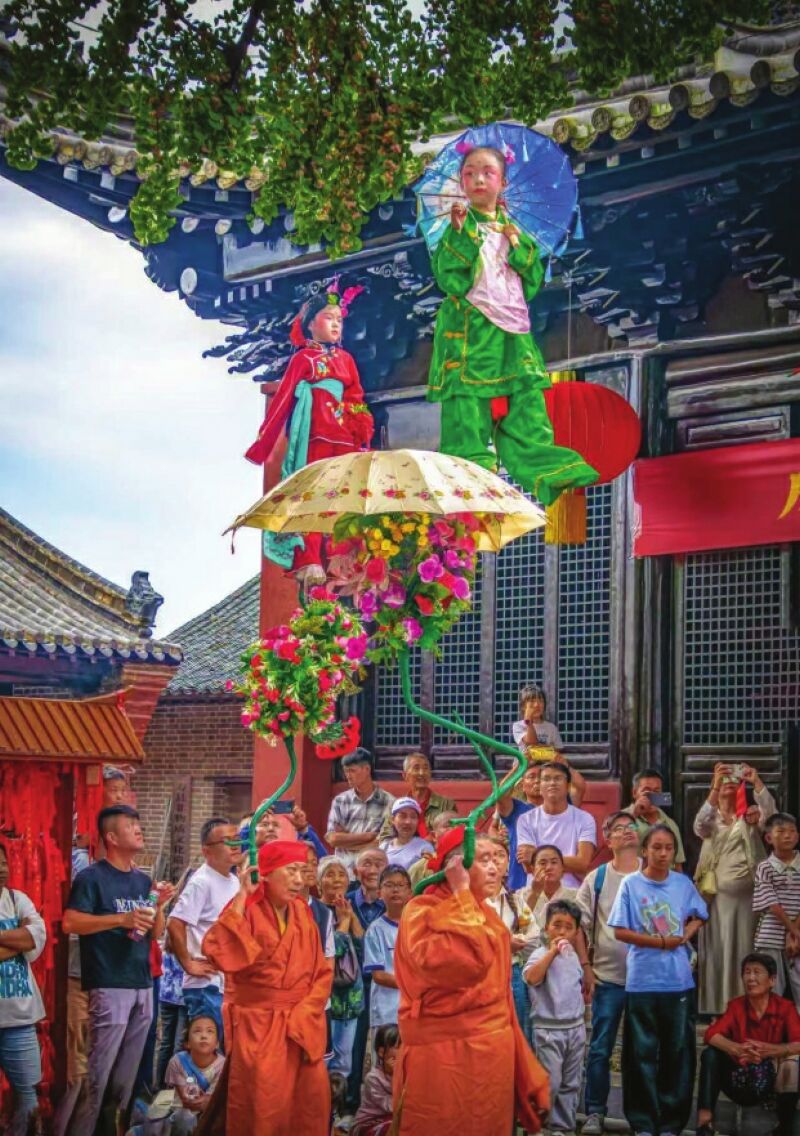 現場,抬閣與肘閣輪番亮相。肘閣上,小演員扮成傳統戲劇人物,在成人頂托的鐵架上輕搖慢擺,盡顯“空中芭蕾”之美;抬閣則由多人抬行,各色人物造型傳遞祈福寓意,被譽為“肩膀上的戲臺”。