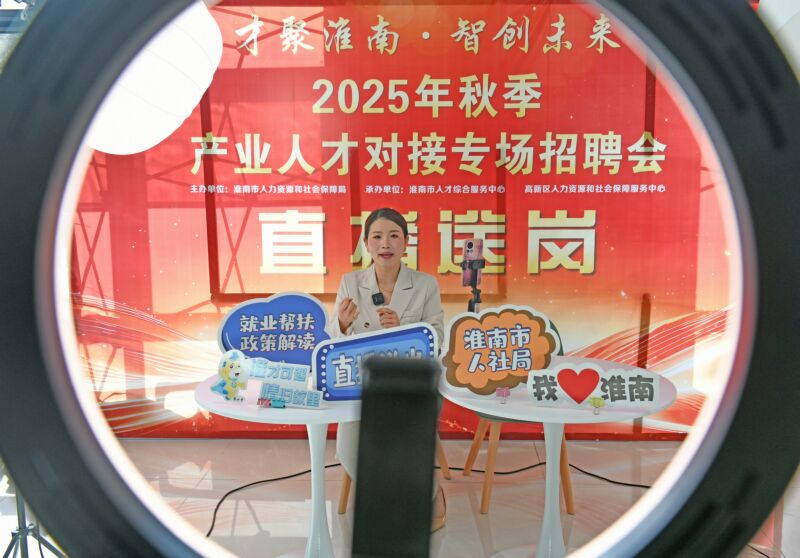 日前,淮南市2025年秋季產(chǎn)業(yè)人才對(duì)接招聘會(huì)現(xiàn)場(chǎng),一名主播通過網(wǎng)絡(luò)介紹招聘企業(yè)用工需求。當(dāng)日,我市舉行2025年秋季產(chǎn)業(yè)人才對(duì)接專場(chǎng)招聘會(huì)。招聘會(huì)采用“線上+線下、分類+分區(qū)”招聘模式,近百家參會(huì)企業(yè)提供就業(yè)崗位1000余個(gè),涉及新能源汽車、先進(jìn)制造業(yè)、信息技術(shù)等多個(gè)產(chǎn)業(yè)。