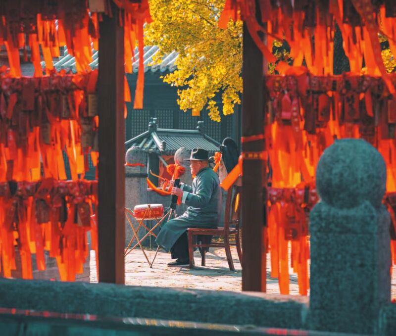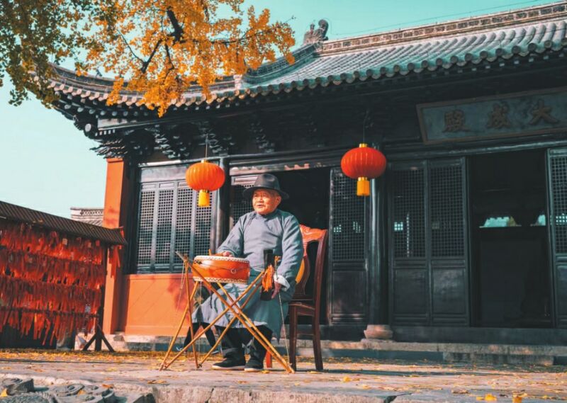 立冬的壽縣孔廟,千年銀杏通體鎏金,與古殿的飛檐斗拱相映如畫。大成殿前,壽州大鼓聲起,震徹云霄。柴現修先生一襲青衫,手持云板擊節(jié),揮動重槌落鼓,開口如鐘鳴般唱起《趙匡胤困南唐》。鼓點密如急雨,唱腔蒼勁沉郁,仿佛將千年時光凝于一聲一韻之中。那銅聲鐵板之間,恍然已是千年流轉,多少悲歡傳奇,皆在這方寸舞臺間重現人間。