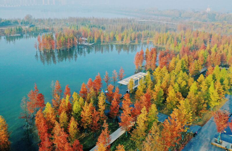 時值小雪節氣,我市西部采煤沉陷區修復治理項目——春申湖公園,千畝落羽杉、池杉彩林,在初冬晨光薄霧的烘托下,如詩如畫、如夢如幻。