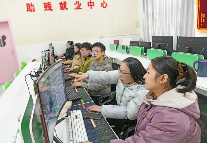 12月3日是第三十四個(gè)國(guó)際殘疾人日。近年來(lái),我市出臺(tái)多項(xiàng)政策扶持殘疾人就業(yè)創(chuàng)業(yè)。圖為大通區(qū)創(chuàng)業(yè)孵化及技能人才培養(yǎng)基地,身殘志堅(jiān)的李傳琴(右二)吸納殘疾人從事自動(dòng)無(wú)人售賣(mài)機(jī)后臺(tái)審核工作。