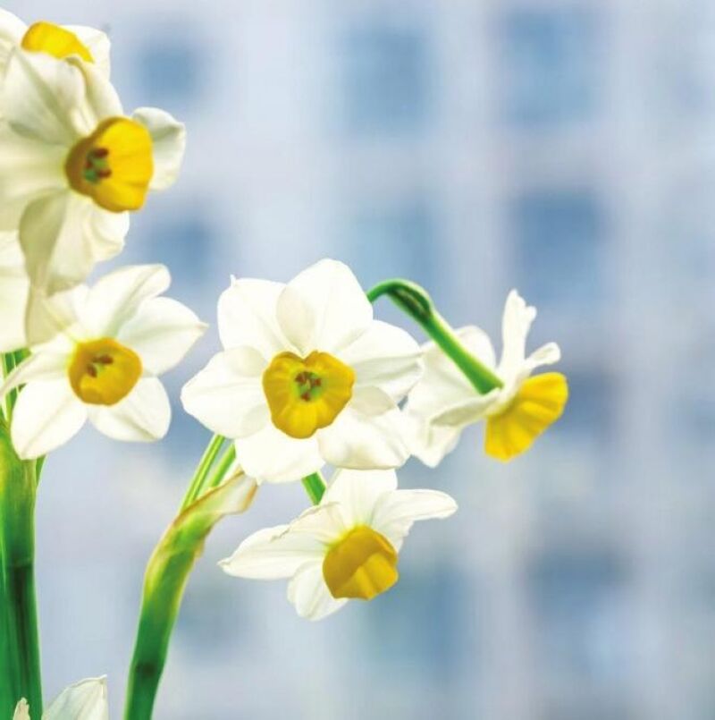 家庭水養水仙花——水仙可盆栽亦可水養,一般家庭多用水養。水養水仙要先剝去球莖外皮并去除根部護泥和枯根,用刀剝去上部3-4層外表皮,露出花芽,再將鱗莖放入清水中浸泡一夜,然后擦去切口粘液,直立放入水仙淺盆,加水淹沒鱗莖三分之一處為宜。盆中可用石英砂、鵝卵石等將鱗莖固定。初養時晚上倒掉盆水,次日清晨換水,稍后2-3天換水一次,花苞形成后每周換水一次。水養水仙要給予充足光照,白天置盆于陽光充足之處,晚上移入室內燈光之下,可防止莖葉徒長,使其葉色碧綠,花開香濃。水仙在10-15℃環境下生長良好,45天左右即可開花,花期可持續月余。水養水仙一般無需施肥,開花期間可稍施速效磷肥,使花朵綻放更加艷麗。