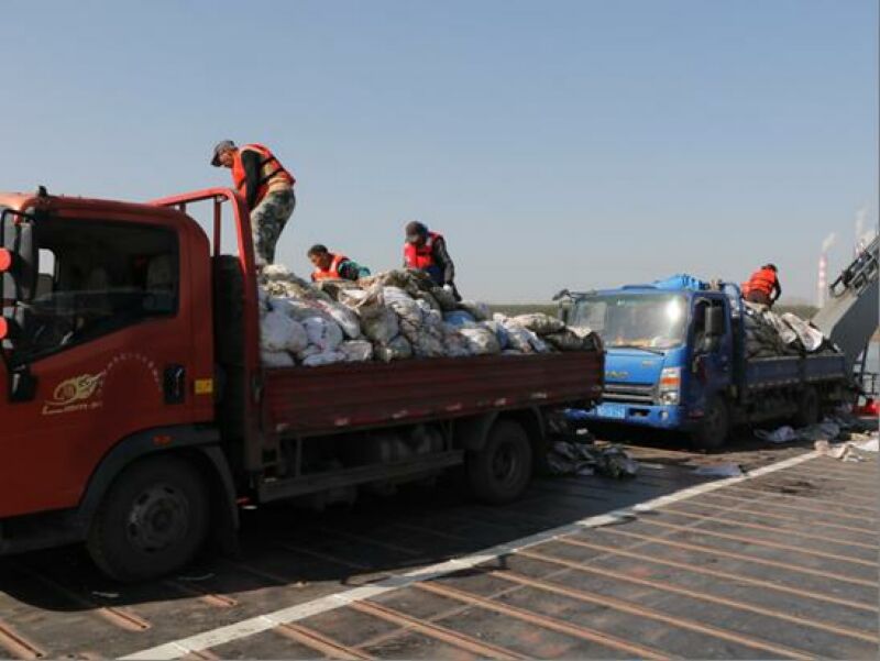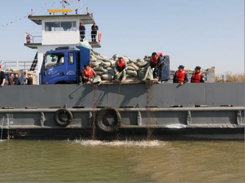 此次人工增殖放流活動為淮南港3號水上綜合服務(wù)區(qū)項目所開展的生態(tài)補償,活動地點位于平圩淮河大橋上游的原連崗碼頭處,該水域?qū)儆诨赐豸~保護區(qū)實驗區(qū)。為確保安全,此次人工增殖放流活動租用了大型渡運船。因底棲生物貨源不同,渡運船先后從淮河北岸及南岸載運裝有底棲生物的貨運車,共計7輛,在船上安置穩(wěn)妥。