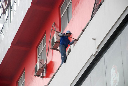 1月31日,記者在舜耕路上看到:一位保潔人員在沒有任何安全保護措施下,站在10多米高的高樓上單獨粉刷外墻,他的腳下大約只有不足10厘米寬墻沿,轉身都非常困難,如果一不留心有可能就會發生高空墮落事故。