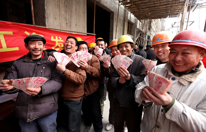 2月3日,謝家集區芳草園改擴建工程建筑工地上230多名外來農民工興高采烈地領取了工資,為了使外來農民工歡歡喜喜踏上返鄉之路,淮南市提早對企業單位拖欠農民工工資情況進行全面調查摸底,登記造冊,開通了投訴舉報電話,幫助農民工通過法律渠道理性維權,對各單位農民工工資發放情況進行監管和督促,協助企業以現金或工資卡方式及時支付農民工工資,確保農民工工資按時發放到位。