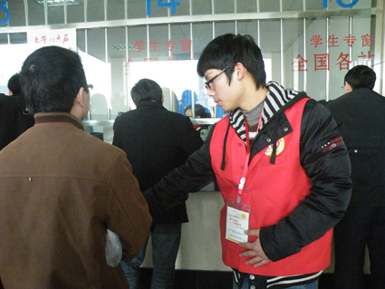 據(jù)淮南西站團(tuán)委副書(shū)記江勁松介紹,這次招募青年志愿者根據(jù)全國(guó)鐵道團(tuán)委及路局團(tuán)委統(tǒng)一部署,第一次面向社會(huì)招募青年志愿者集中開(kāi)展鐵路春運(yùn)志愿服務(wù)。在此之前,每年春運(yùn)期間,他們所組織的志愿者都是來(lái)自淮南西站內(nèi)部,在這次招募志愿者活動(dòng)中,考慮到是第一次,沒(méi)有什么太多的經(jīng)驗(yàn),因此他們只與安徽理工大學(xué)團(tuán)委聯(lián)系,在安理大以公開(kāi)招募、自愿報(bào)名的形式招募青年志愿者。自1月上旬春運(yùn)志愿者招募消息發(fā)布之后,淮南籍和春節(jié)留校的大學(xué)生報(bào)名非常踴躍。近百名學(xué)子通過(guò)網(wǎng)站、QQ群、電話(huà)等方式登記報(bào)名。經(jīng)過(guò)層層篩選、培訓(xùn)、考核,從報(bào)名的大學(xué)生中選定了28名政治素質(zhì)高、服務(wù)意識(shí)強(qiáng)、樂(lè)于助人的社會(huì)青年志愿者。自1月30日春運(yùn)啟動(dòng)以來(lái),他們?nèi)虆⑴c淮南站春運(yùn)服務(wù)工作。