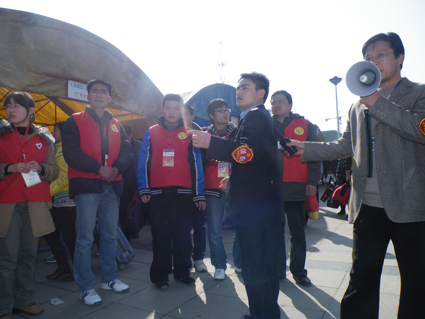 圖二:大學(xué)生志愿者集中在一起等待分配任務(wù)后上崗。