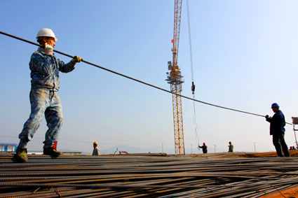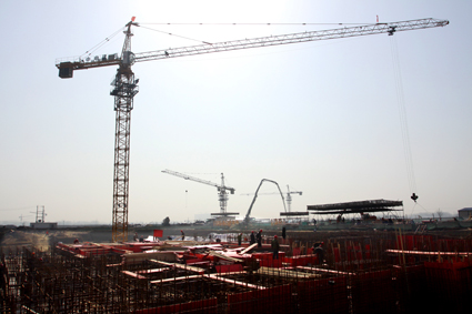 圖一:山南新區建設工地內塔吊林立,一派繁忙景象。 圖二:建筑工人為山南新區建設辛勤工作。