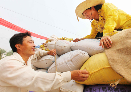 6月24日,大通區(qū)農(nóng)民在大通糧食分局漁場中心糧站喜售豐收糧。預(yù)計(jì),全市小麥平均畝產(chǎn)784斤,總產(chǎn)達(dá)60萬噸,比去年略有增產(chǎn)。今年小麥?zhǔn)召弮r格又有所提高,從而極大地提高了種糧大戶和農(nóng)民售糧的積極性,出現(xiàn)銷售與收購熱潮。