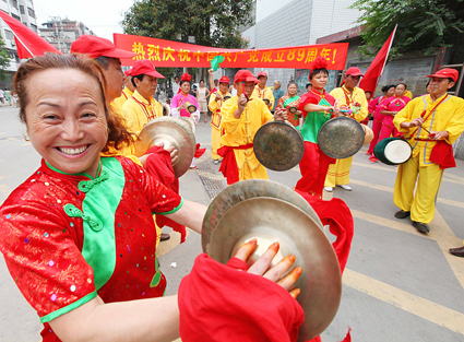 7月1日,謝家集區鬧市區一群退休老人打著喜慶的鑼鼓,跳著歡快的舞步喜迎“七一”。他們用這種群眾喜聞樂見的方式,宣傳黨的方針政策,歌頌黨的豐功偉績,盡情抒發對黨的熱愛和對美好生活的憧憬。