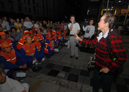 圖為8月20日晚,田家庵區洞山街道新村社區文藝愛好者聶鵬梅為納涼的環衛工人演唱豫劇《朝陽溝》。