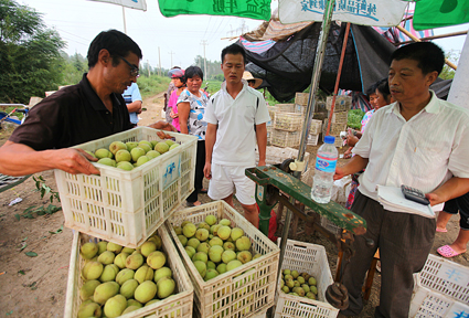 近年來,該鎮(zhèn)大力實(shí)施“雙培雙帶”先鋒工程,積極引導(dǎo)農(nóng)民種植脆桃,走特色產(chǎn)業(yè)致富之路。目前,曹店村紅心脆桃種植示范園面積已發(fā)展到300多畝,年增效益60萬元。目前,該果園桃子正是豐收季節(jié),每天吸引大量當(dāng)?shù)亍⑼獾嘏l(fā)商到田間地頭來收購紅心脆桃。