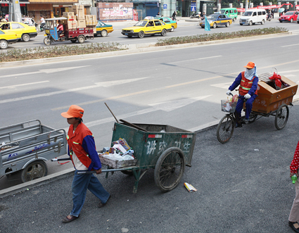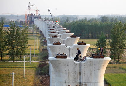 圖一為建設者們在合淮蚌客運專線工地加緊施工。 圖二為城市美容師在辛勤工作。 圖三為電力工人加班加點。