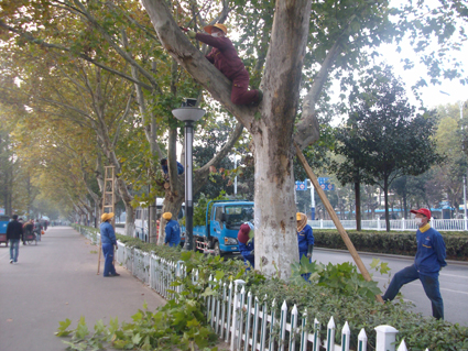 11月2日,記者在洞山中路上看到,園林局相關工作人員拿著電鋸正在對樹木枝葉進行修剪。工人師傅們有的站在梯子上,有的借助梯子登上樹干,在電鋸的“嗡嗡”聲中,那些旁逸斜出的枯枝、病蟲枝紛紛墜落于地。地面上的工人及時地將落地枝條投入到運載貨車內,環衛工人也緊隨其后,將路面清掃得干干凈凈。一切進行得是那么井然有序,而在他們工作過的地方,我們看到經過修飾后穿戴整潔的樹木,就像哨兵般昂然聳立著。