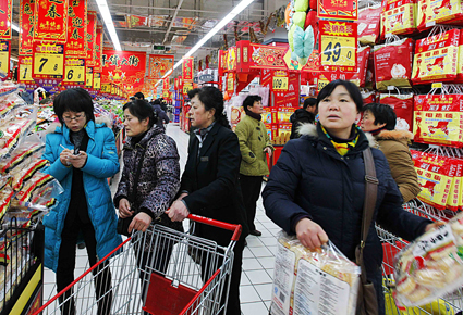 1月20日,市民們在大型超市內精心選購年貨。隨著新春佳節臨近,我市各大超市用紅燈籠和福字裝飾一新,吃用的商品和禮品一應俱全,琳瑯滿目,各種促銷活動吸引人們購買,紅紅火火喜慶迎春節。