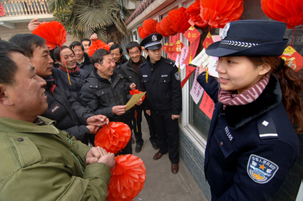 2月14日上午,元宵佳節(jié)前夕,淮南市公安局毛集分局,將平時警民共建和諧及安全自我防范等方面的內(nèi)容,制成20多個元宵燈謎字條,貼到社區(qū)里,在活躍轄區(qū)居民元宵節(jié)日生活的同時也增添了節(jié)日氣氛,吸引了不少居民前來猜燈謎。圖為民警們在毛集實驗區(qū)毛集鎮(zhèn)梁庵社區(qū)里與居民共同猜燈謎。