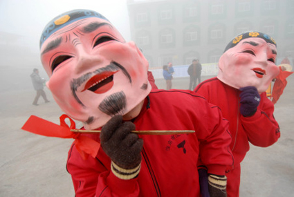 春節期間,淮南市謝家集社區文藝愛好者編排表演各類群眾喜聞樂見的文藝節目,豐富節日文化生活。近年來,謝家集大力實施文化惠民工程,建設文化大院,組織文藝團隊演出,推動群眾性文化活動開展。正月十五元宵佳節上午,“社區大家樂”活動在很多社區展開,圖為兩名社區文藝愛好者頭戴大頭娃娃面具在李郢孜鎮新河社區盡情表演,把歡樂和笑聲送給居民。