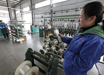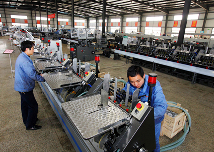 圖:在總裝車間里,工人們正在校驗剛下線的環保型膠訂聯動機。 圖:女工們在精心測試產品。