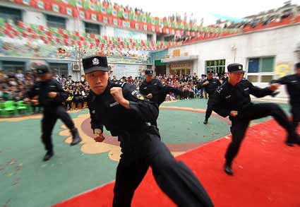 5月25日上午,田家庵區第五幼兒園在“六一”前夕,邀請市公安局特警隊員來到幼兒園為幼兒及家長現場表演“防范技能功夫”,此舉不但向孩子們展示自我防范能力,而且有助于完善幼兒園處置突發事件和預防控制犯罪的措施,同時也是在節日里送給孩子們的安全與快樂禮物,受到了老師及家長和孩子們的歡迎。