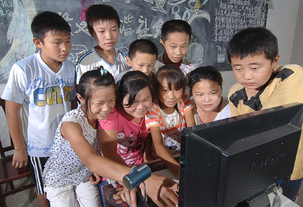 今年,毛集實驗區全區農村地區確定建立11個留守兒童之家,配備電話、電視及電腦網絡等設施,使部分留守兒童雖不能在父母身邊過暑假,也能享受到快樂的暑假生活。圖為7月11日,在董崗學校里的“留守兒童之家”里,學生們正在與遠在外地的父母進行網上視頻對話的場景。