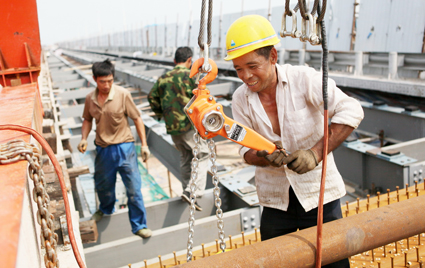 8月15日上午11點,淮河大橋修固工程正在高溫下緊張施工。據(jù)了解,為保證工期,工人們加班加點,日夜施工。目前主橋兩個橋頭堡之間正進行到鋪波折板階段,預(yù)計本月19日開始此路段的凝泥土澆筑工程。