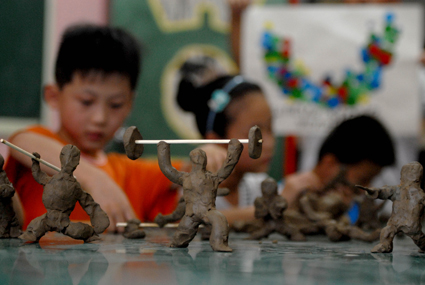 第26屆世界大學生夏季運動會各項賽事正在精彩舉行,連日來,中國大學生選手的出色表現激發了美術學校小學生們的創作熱情,他們在暑期興趣班中通過泥塑造型藝術,展現選手風采。圖為美術學校小學生通過泥塑造型展示第26屆世界大學生夏季運動會比賽項目。