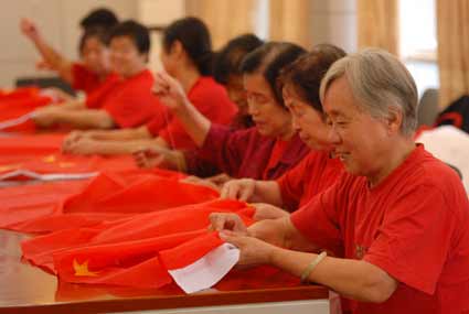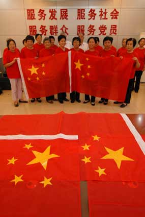 國慶節前夕,田家庵區洞山街道新村社區大媽通過繡國旗、唱紅歌等多種活動,表達對祖國的美好祝福。圖為9月29日,社區大媽織繡和展示國旗。