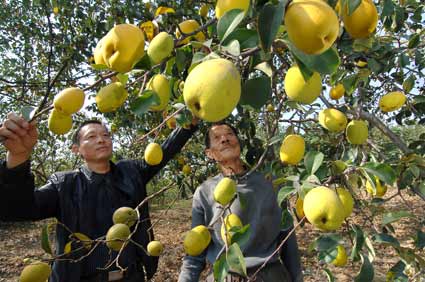 享有“木瓜村”美譽的淮南市八公山區山王鎮林場社區(村),在原有栽植數量的基礎上,近兩年又擴大了木瓜栽植規模,現已發展形成家家戶戶房前屋后木瓜飄香的喜人場景。金秋時節,木瓜村近1萬株木瓜樹結出碩果,黃澄澄、香噴噴的木瓜掛滿枝頭,讓農民朋友充分享受到豐收的喜悅。此類木瓜可藥用,可作美容原料,可觀賞,具有很高的經濟價值,十分暢銷。這是該社區(村)為了充分開發和利用本地地形優勢資源,發展果樹經濟所取得的可喜成果。圖為10月19日上午村民正在選摘成熟木瓜時的情景。