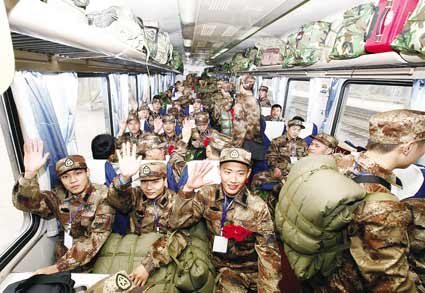 圖三:帶著家鄉(xiāng)父老鄉(xiāng)親的希望與囑托,進(jìn)藏新兵自豪地乘火車奔赴軍營(yíng)。