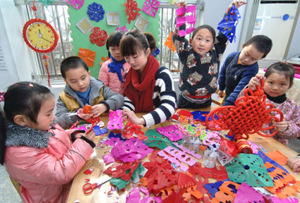 2月17日上午,淮南市田家庵區(qū)第4幼兒園。為了讓小朋友從小接觸并了解剪紙、中國結(jié)、草編及皮影戲等這些世界“非遺”民間藝術(shù),增強(qiáng)他們對非物質(zhì)文化遺產(chǎn)傳承愛護(hù)意識,老師讓孩子們通過游戲和自己動手,將五顏六色的彩紙,剪出自己喜愛的圖案,使小朋友在寓教于樂中快樂地成長。圖為指導(dǎo)老師現(xiàn)場給小朋友教授“非遺”時(shí)的場景。