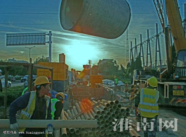 圖:10月16日,在國慶路部分路段,石姚灣凈水廠及配套管網施工一片火熱,工程技術人員正在搶抓工期,精心施工,確保配套管網DN1400應急部分10月底完工。(記者 李 鈞 蘇國義 倪 軍 陳海濤)