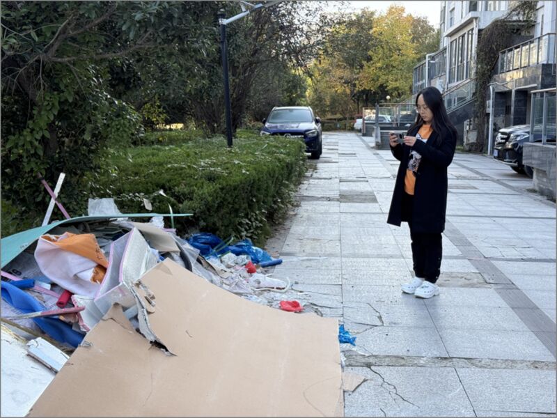 “在這里上班挺好,主要與小區居民打交道,按時下班,還能順路買個菜,生活充實也開心!瘪姻┬χf道。日常工作中,她不僅是門崗登記員,也負責小區環境巡查。當天在19號樓前,她發現一處隨意傾倒的建筑垃圾后,立即拍照上報;在17號樓裝修現場,她提醒工人注意施工時間,避免擾民。細致的工作,讓她成為小區管理中不可或缺的一環。