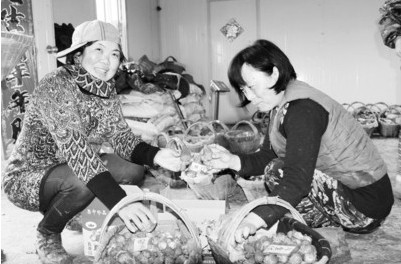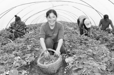 淮南市大通區孔店鄉大郢村通過土地流轉,規模種植綠色無公害果蔬,全村30多戶專業瓜果蔬菜種植大戶,不僅實現了快速致富,還為本村村民提供了近百個工作崗位。眼下正是大棚草莓上市時節,村里不少婦女采摘草莓,月收入達到3000元左右。 本報記者 孫玉寶 攝影報道 圖一:摘下的草莓依次擺好準備過秤。 圖二:歡快的勞動場景讓她們忘卻了疲勞。 圖三: 比一比誰摘的草莓大。