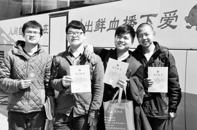 3月15日、16日兩天,安徽理工大學測繪學院、醫學院、能源與安全學院的大學生利用雙休日在校園開展無償獻血、造血干細胞捐獻采樣、為貧困留守兒童募捐和應急救護科普知識宣傳等一系列公益活動。圖為幾位同學結伴參加獻血和造血干細胞捐獻采樣后留影。 陳玉琴 攝